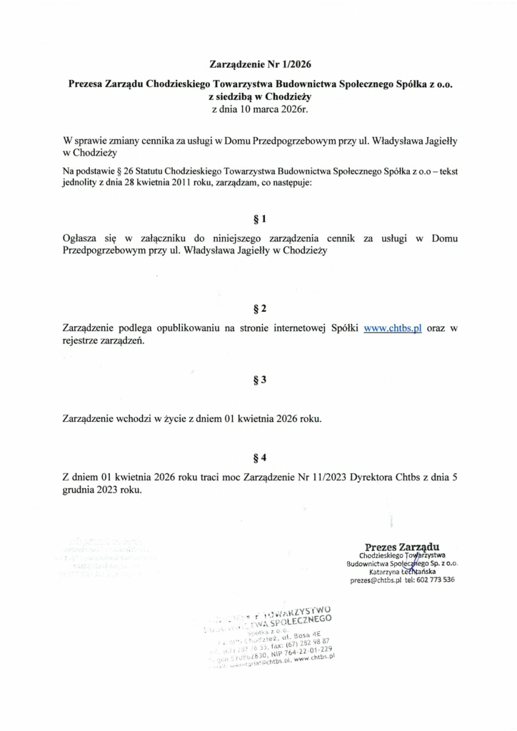 CENNIK ZA USŁUGI W DOMU PRZEDPOGRZEBOWYM PRZY UL. WŁADYSŁAWA JAGIEŁŁY W CHODZIEŻY